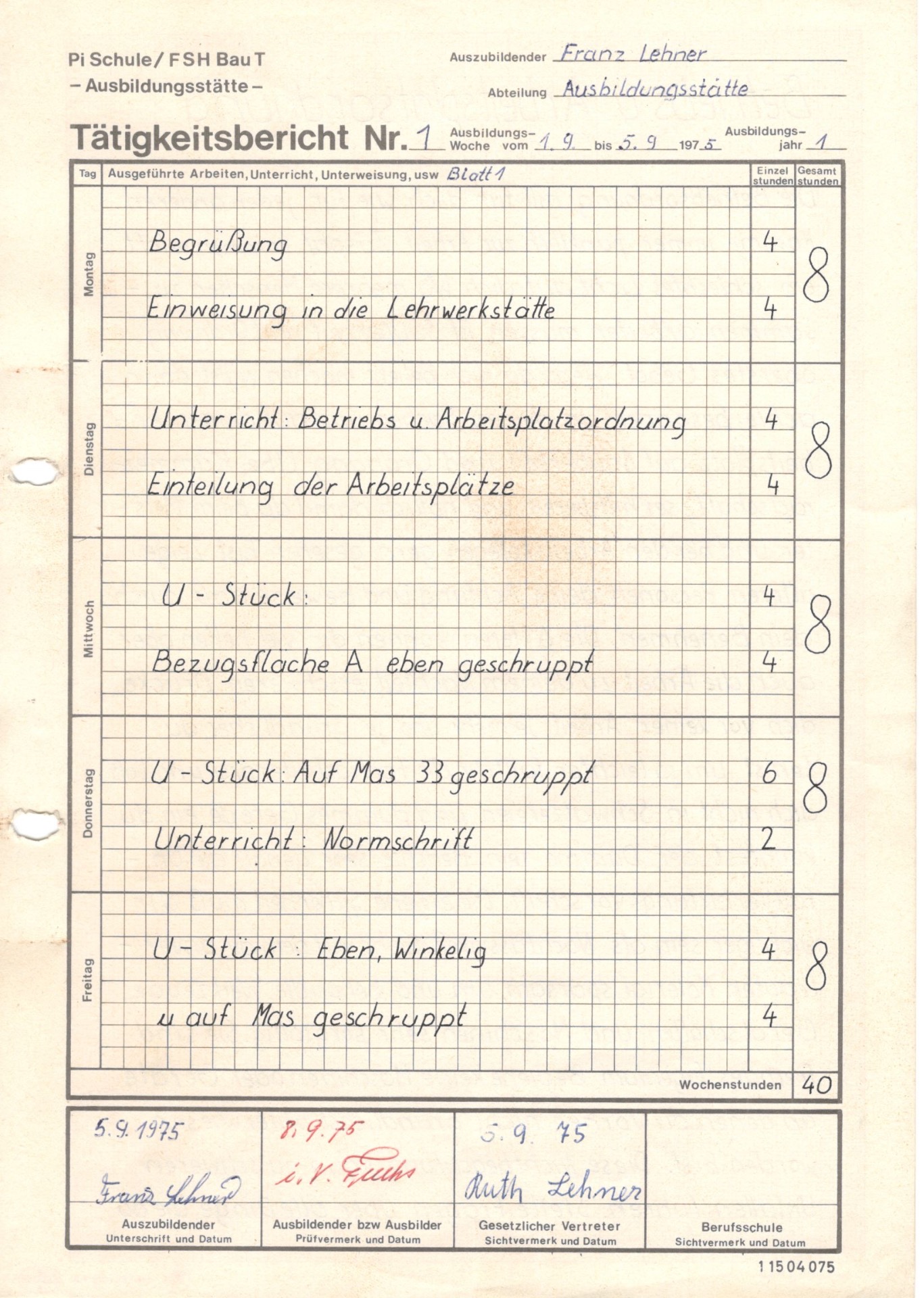 Das ist schon eine Weile her. Genau gesagt war es im September 1975. In der ersten Woche wurden wir Lehrlinge, später, hießen wir Auszubildende, "eingenordet". Das bedeutet, es wurde uns gesagt, was von uns erwartet wurde. Damit das auch wirklich hängen bleibt, mussten wir dies in 75 ° Normschrift auf einem Berichtsheftblatt aufschreiben, weil, was man selbst aufschreibt, bleibt länger hängen.